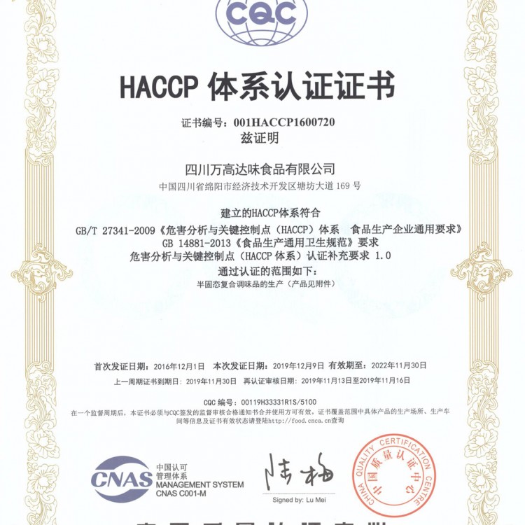 HACCP體系認證證書