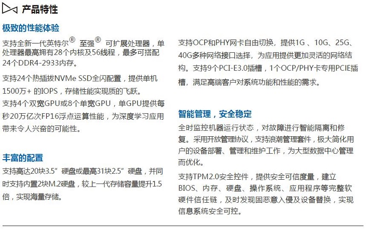 支持全新一代英特爾® 至強(qiáng)® 可擴(kuò)展處理器,單處理器支持擁有28個(gè)內(nèi)核及56線程,支持搭配24個(gè)DDR4-2933內(nèi)存。支持24個(gè)熱插拔NVMe SSD全閃配置,提供單機(jī)1500萬(wàn)+ 的IOPS,存儲(chǔ)性能實(shí)現(xiàn)質(zhì)的飛躍。支持4個(gè)雙寬GPU或8個(gè)單寬GPU,單GPU提供每秒20萬(wàn)億次FP16浮點(diǎn)運(yùn)算性能,為深度學(xué)習(xí)應(yīng)用帶來(lái)令人興奮的可能性。