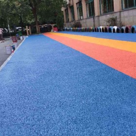 作為一種新的環保型、生態型的道路材料,該種透水路面面板鋪裝厚度根據巖性以及采用單粒徑巖石粒徑決定,一般厚度范圍在4~7cm。基層結構可以采用半剛性基層或者是級配碎石、級配礫石透水基層,具有良好的透水性,是由聚氨酯膠粘劑與單級配或間斷級配骨料按一定配合比拌合而成的新型路面材料。目前該種材料主要用于鋪裝景觀道路等輕交通路面。