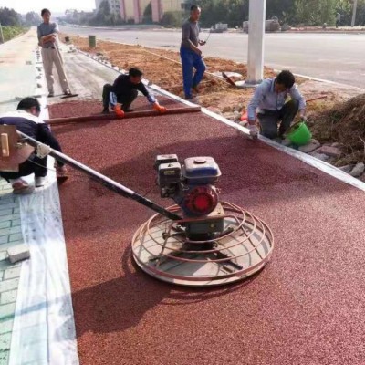 透水混凝土屬干性混凝土料,其初凝快,攤鋪必須及時。對于人行道面,大面積施工采用分倉方式進行攤鋪,其松鋪系數為1.1。將混合物均勻攤鋪在工作面上,用刮尺找準平整度和控制一定的泛水度,用抹刀抹平,抹合不能有明水。